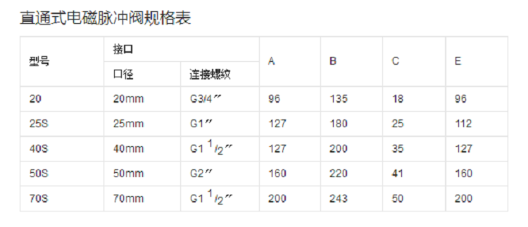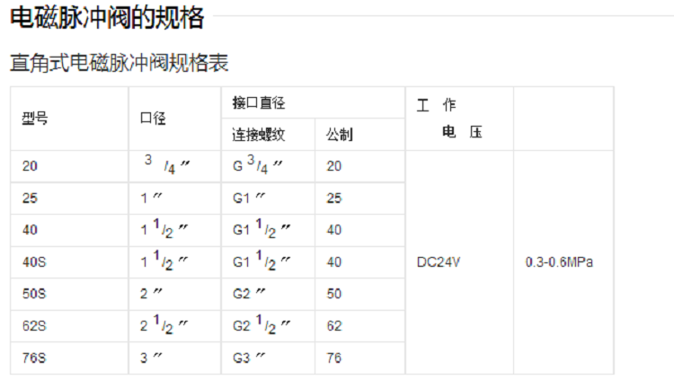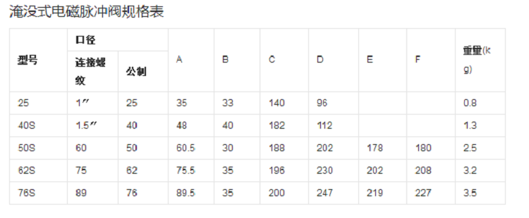 電磁脈沖閥的規(guī)格型號(hào)不同,它的具體參數(shù)也不一樣,下面是常用的型號(hào)參數(shù)表: